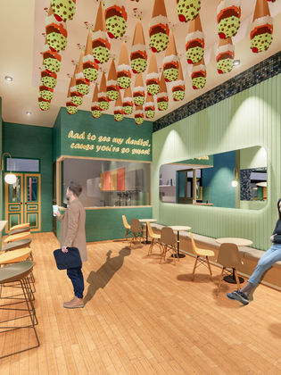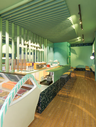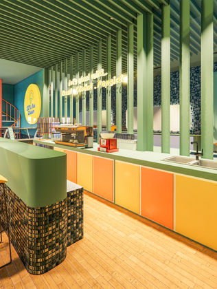 Tiff’s Ice Cream is a retro concept ice cream shop with a color palette of turquoise and yellow. The shop can accommodate up to 60 persons, the dining area is positioned on the first and second floor. While all the staff activity and service area is done on the third floor.